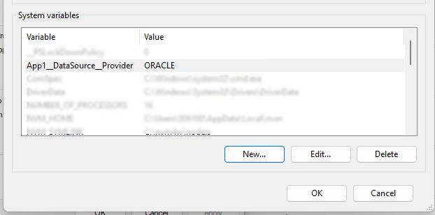 ตัวอย่างเช่น จากเดิมที่ใช้งานค่า DataSource__Provider=ORACLE สามารถปรับให้รองรับหลายแอปพลิเคชันได้โดยเพิ่ม Prefix ของชื่อแอปเข้าไป เช่น App1__DataSource__Provider=ORACLE เพื่อให้สามารถแยก Environment ของแต่ละแอปได้อย่างชัดเจน