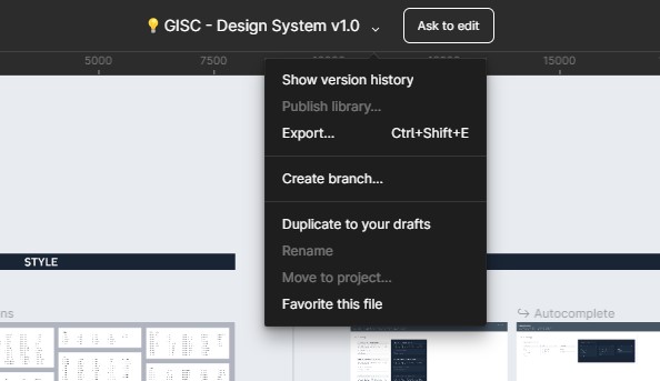 2. คลิกที่ปุ่มลูกศรหลังชื่อไฟล์ GISC – Design System v1.0 จากนั้นคลิกที่ Duplicate to your drafts เพื่อทำสำเนาไฟล์มาไว้สร้างเป็น Prototype ของโครงการ